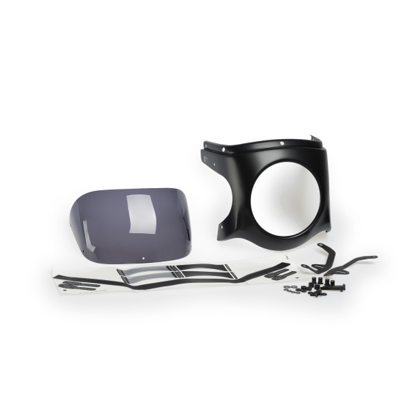 La pieza se compone de una carcása opaca, con acabado negro mate o símil carbono, y una cúpula ahumada clara, oscura, negra o transparente.
