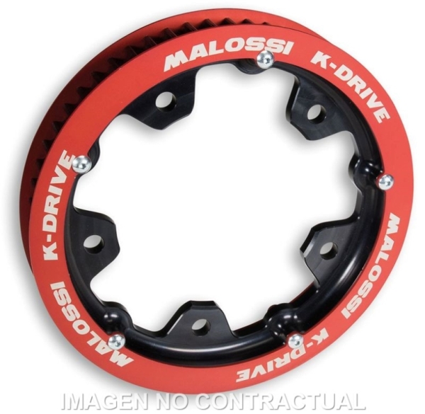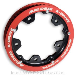 Las coronas están realizadas con aluminio y se han sometido a oxidación dura y una coloración negra. Con este tratamiento Malossi ha mantenido una geometría especialmente ligera de la pieza garantizando una gran resistencia al desgaste. La dentadura se realiza con una herramienta especial perfilada para que la transmisión de la moto con la correa sea fluida y silenciosa. Las dentaduras disponibles son z.56, 57, 58. El marcado se realiza en las planchas anodizadas rojas enroscadas al engranaje que contienen la correa.