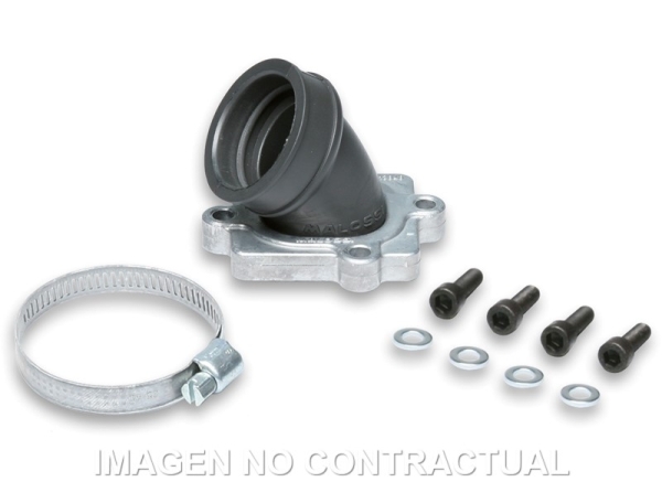 Estos colectores Malossi se suministran desmontados: se puede rotar el manguito dentro de la brida según las exigencias específicas del propio vehículo permitiendo así determinar el mejor ángulo para el montaje del carburador