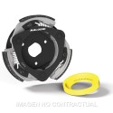 MAXI DELTA CLUCTH permite obtener de 3 a 9 regulaciones distintas, simplemente accionando tres tornillos de fijación, así como de 9 a 27 variaciones, cambiando los muelles y las masas adicionales de acero de calibración, según el tipo de scooter, produciendo otros tantos regímenes de revoluciones, en cuyo rango se determina el momento de entrada de la tracción, con el fin de optimizar la aceleración al