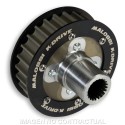 Piñones realizados en aluminio, con una oxidación dura profunda de 25 micron. Con este tratamiento Malossi ha mantenido una geometría especialmente ligera de la pieza garantizando una gran resistencia al desgaste. El buje central está fabricado con un acero aleado especial, sin tratamiento térmico para no aumentar demasiado la dureza y evitar que se creen problemas en el arrastre con el eje de transmisión del motor.