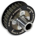 Piñones realizados en aluminio, con un tratamiento de dureza de 25 micron. Con este tratamiento Malossi ha mantenido una geometría especialmente ligera de la pieza garantizando una gran resistencia al desgaste. El buje central está fabricado con un acero aleación especial, sin tratamiento térmico para no aumentar demasiado la dureza y evitar que se creen problemas en el arrastre con el eje de transmisión del motor.