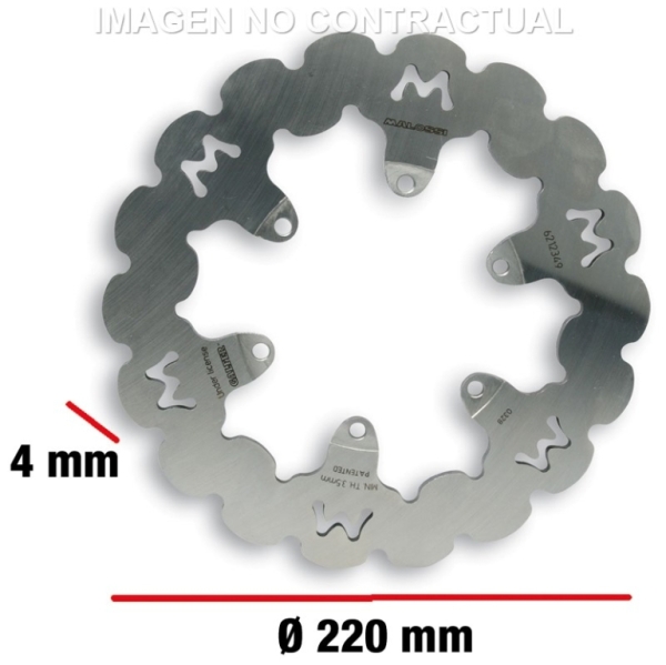 Disco de acero inoxidable, trabajado con láser, bonificado y rectificado. Calculado para rasurar completamente la superficie de rozamiento ,eliminar el polvo, evacuar el agua y el barro durante la frenada, manteniendo la temperatura baja.