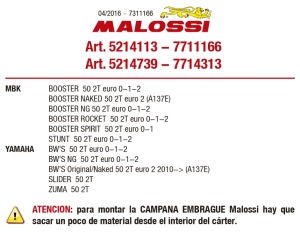 MBK CW Booster 50 (0-0) Euro 0-1-2ATENCION: para montar la CAMPANA EMBRAGUE Malossi hay que sacar un poco de material desde el interior del cárter