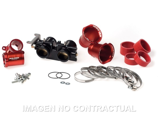 Los dos colectores suministrados con el kit están aumentados y se pueden instalar sólo en una culata trabajada sin necesitar ninguna ulterior modificación. Las trompetas específicas para el cuerpo mariposa MHR son calculadas y optimizadas para obtener el máximo rendimiento de las secciones ovales de los cuerpos, aprovechando la armonización perfecta de todo el conducto