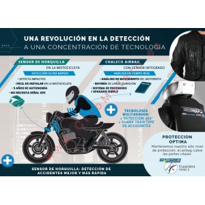 SENSOR DE HORQUILLA: Se trata de un pequeño sensor que se aloja en la barra de horquilla de la moto para detectar impactos, fácil de instalar, con una autonomía de 5 años y sin necesidad de señal GPS. Este dispositivo está en constante comunicación con el chaleco airbag para hacerlo saltar en caso de impacto de la moto y antes de que el chaleco detecte la caída. El primer impacto, frontal o desde la parte trasera, siempre lo recibe la moto y el piloto sale despedido en consecuencia, pero hasta que esto sucede, puede pasar un tiempo entre que la moto recibe el impacto y el piloto sale despedido (momento en el que se activaría el airbag), incluso podría golpearse con algún elemento de la moto como la cúpula o manillar, antes de que se activara el chaleco. Este dispositivo instalado en la horquilla, detectará el impacto en la moto y dará orden de salto al chaleco, estando por tanto protegido el piloto no solo desde que sale despedido de la moto sino desde que la propia moto tiene el impacto.
