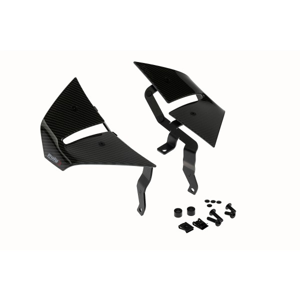 Estos alerones laterales han sido desarrollados para ofrecer el máximo rendimiento aerodinámico en motos de altas prestaciones. El innovador diseño de doble ala, con superficies diferenciadas y separadas por un winglet lateral, permite canalizar el flujo del aire hacia la parte superior, generando una mayor carga aerodinámica (downforce) sin penalizar el coeficiente aerodinámico del conjunto.