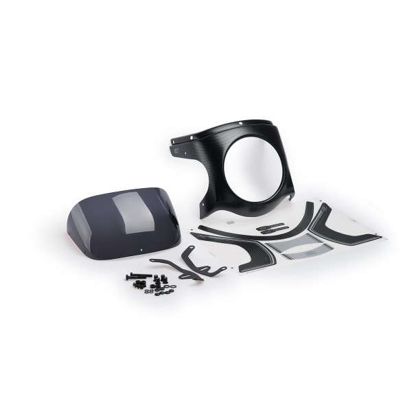 La pieza se compone de una carcása opaca, con acabado negro mate o símil carbono, y una cúpula ahumada clara, oscura, negra o transparente.