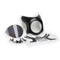La pieza se compone de una carcása opaca, con acabado negro mate o símil carbono, y una cúpula ahumada clara, oscura, negra o transparente.