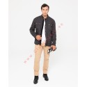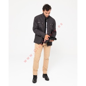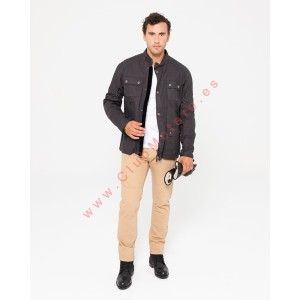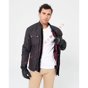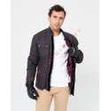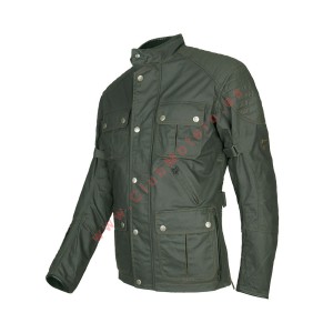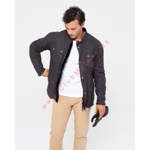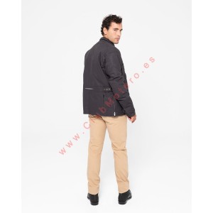 Chaqueta de moto hombre resistente fabricada en algodón encerado con cremallera metálica central YKK de doble cursor. Incluye once bolsillos exteriores y dos interiores para almacenamiento conveniente. Ajustable en la cintura para un ajuste personalizado y equipada con membrana interna impermeable HIPORA. Incluye forro interior manga larga desmontable 2 en 1 y bolsillo para protección de espalda. Ideal para condiciones climáticas variables y actividades al aire libre.