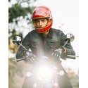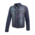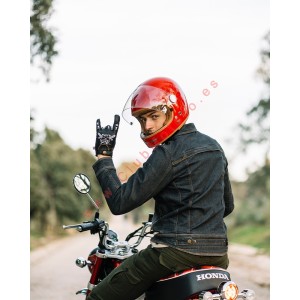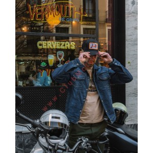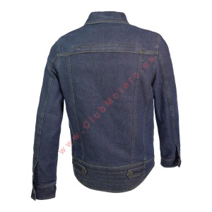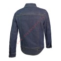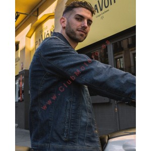 Chaqueta de moto en denim de algodón con hilo recubierto, ajustable en muñeca y cintura. Con cuatro bolsillos exteriores y aberturas de ventilación frontal y trasera. Preparada para forro (no incluido) y con bolsillos interiores para protecciones adicionales.