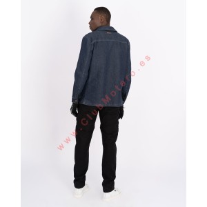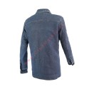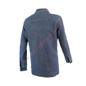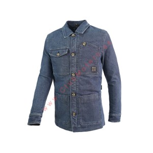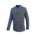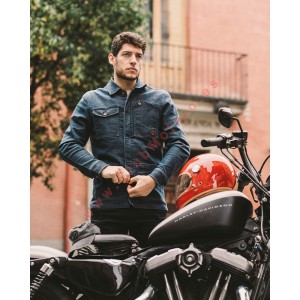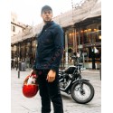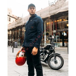 Chaqueta de moto para hombre en algodón denim con tecnología de hilo recubierto. Ajustable en muñeca, con bolsillos exteriores e interiores. Cierres con cremalleras YKK y botones. Preparada para forro (no incluido) y bolsillos internos para protecciones (protección de espalda no incluida).