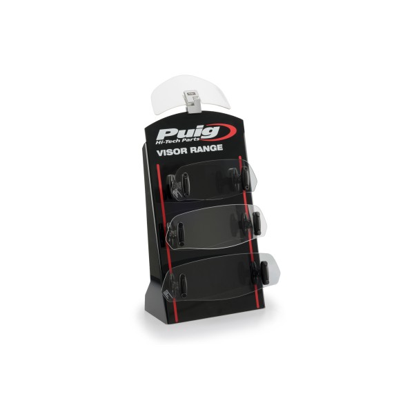 Si quieres mostrarlas de manera elegante e intuitiva, puedes hacerlo mediante el soporte Puig para viseras y deflectores de cúpulas. Muestra los diferentes tipos de visera Puig Hi-Tech Parts disponibles en el catálogo con tan solo un expositor, no necesitarás nada más.