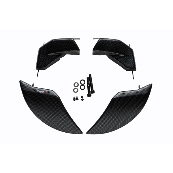 Sus soportes de acero inoxidable, ligeros y resistentes, cuentan con un elegante acabado en negro texturizado, que se integra perfectamente en la estética deportiva de la moto.