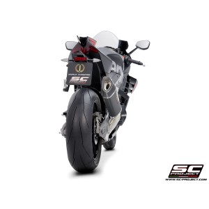 Esta solución permite una importante reducción de peso -55% en comparación con el escape original, esta obra maestra de la tecnología permite situarse dentro de los decibelios permitidos para el uso en pista: 104 dB a 6500 rpm con dB-killer instalado / que pasan a ser 109 dB a 6500 rpm sin dB-killer. Para el uso en competición, el dB-killer es desmontable: la boca de salida obtenida mediante el proceso de hidroformado y el embellecedor de Fibra de Carbono con su forma romboidal y asimétrica hacen del slip-on SC1-R la mejor elección para esta moto. Para esta aplicación, la cubierta exterior está disponible en dos opciones: Titanio o Fibra de Carbono.