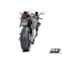 Para el uso en competición, el dB-killer es desmontable: la boca de salida obtenida mediante el proceso de hidroformado y el embellecedor de Fibra de Carbono con su forma romboidal y asimétrica hacen del slip-on SC1-R la mejor elección para esta moto. Para esta aplicación, la cubierta exterior está disponible en dos opciones: Titanio o Fibra de Carbono.