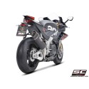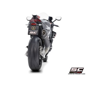 Esta solución permite una importante reducción de peso -43% en comparación con el escape original, esta obra maestra de la tecnología permite situarse dentro de los decibelios permitidos para el uso en pista: 102 dB @ 6500 rpm con dB-killer instalado / que pasan a ser 104dB @6500 rpm sin dB-killer. Para el uso en competición, el dB-killer es desmontable: la boca de salida obtenida mediante el proceso de hidroformado y el embellecedor de Fibra de Carbono con su forma romboidal y asimétrica hacen del slip-on SC1-R la mejor elección para esta moto. Para esta aplicación, la cubierta exterior está disponible en dos opciones: Titanio o Fibra de Carbono.