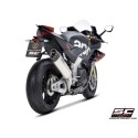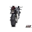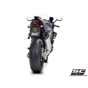 Esta solución permite una importante reducción de peso -43% en comparación con el escape original, esta obra maestra de la tecnología permite situarse dentro de los decibelios permitidos para el uso en pista: 102 dB @ 6500 rpm con dB-killer instalado / que pasan a ser 104dB @6500 rpm sin dB-killer. Para el uso en competición, el dB-killer es desmontable: la boca de salida obtenida mediante el proceso de hidroformado y el embellecedor de Fibra de Carbono con su forma romboidal y asimétrica hacen del slip-on SC1-R la mejor elección para esta moto. Para esta aplicación, la cubierta exterior está disponible en dos opciones: Titanio o Fibra de Carbono.