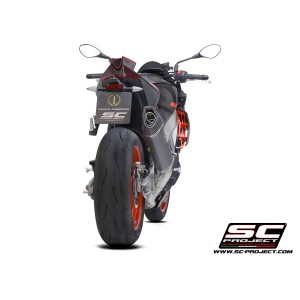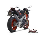 Esta solución permite una importante reducción de peso -43% en comparación con el escape original, esta obra maestra de la tecnología permite situarse dentro de los decibelios permitidos para el uso en pista: 102 dB @ 6500 rpm con dB-killer instalado / que pasan a ser 104dB @6500 rpm sin dB-killer. Para el uso en competición, el dB-killer es desmontable: la boca de salida obtenida mediante el proceso de hidroformado y el embellecedor de Fibra de Carbono con su forma romboidal y asimétrica hacen del slip-on SC1-R la mejor elección para esta moto. Para esta aplicación, la cubierta exterior está disponible en dos opciones: Titanio o Fibra de Carbono.