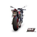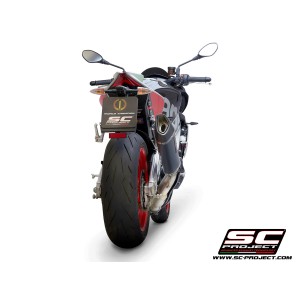 El silenciador SC1-R está creado y desarrollado a partir de la experiencia del departamento de carreras de SC-Project en las competiciones mundiales más importantes. Un look de líneas tensas y decididas enriquecerá Tu Aprilia Tuono V4 1100 haciéndola única y exclusiva. La salida obtenida por hidroformado y el fondo de fibra de carbono con forma romboidal asimétrica hacen que el silenciador SC1-R sea inimitable. El cuerpo exterior ligero está disponible en versiones de Titanio y Carbono. Las soldaduras T.I.G., el material fonoabsorbente resistente a muy altas temperaturas y los casquillos de inserción mecanizados en macizo mediante mecanizado CNC embellecen el silenciador SC1-R. En la versión con cuerpo de Titanio, el departamento de R&D de SC-Project quiso hacer más elegante el SC1-R imprimiendo el Logo con láser, sin distorsionar su aspecto, mientras que en la versión de Carbono, un inserto con el logo de SC-Project está remachado en el silenciador como en las versiones de nuestros escapes utilizados en Competiciones. El kit incluye la protección termal de carbono.