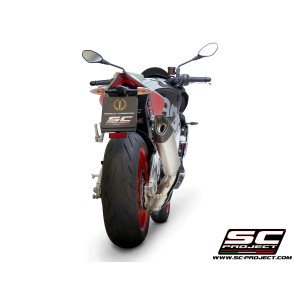 El silenciador SC1-R está creado y desarrollado a partir de la experiencia del departamento de carreras de SC-Project en las competiciones mundiales más importantes. Un look de líneas tensas y decididas enriquecerá Tu Aprilia Tuono V4 1100 haciéndola única y exclusiva. La salida obtenida por hidroformado y el fondo de fibra de carbono con forma romboidal asimétrica hacen que el silenciador SC1-R sea inimitable. El cuerpo exterior ligero está disponible en versiones de Titanio y Carbono. Las soldaduras T.I.G., el material fonoabsorbente resistente a muy altas temperaturas y los casquillos de inserción mecanizados en macizo mediante mecanizado CNC embellecen el silenciador SC1-R. En la versión con cuerpo de Titanio, el departamento de R&D de SC-Project quiso hacer más elegante el SC1-R imprimiendo el Logo con láser, sin distorsionar su aspecto, mientras que en la versión de Carbono, un inserto con el logo de SC-Project está remachado en el silenciador como en las versiones de nuestros escapes utilizados en Competiciones. El kit incluye la protección termal de carbono.