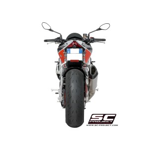 El silenciador SC1-R está creado y desarrollado a partir de la experiencia del departamento de carreras de SC-Project en las competiciones mundiales más importantes. Un look de líneas tensas y decididas enriquecerá Tu Aprilia Tuono V4 haciéndola única y exclusiva. La salida obtenida por hidroformado y el fondo de fibra de carbono con forma romboidal asimétrica hacen que el silenciador SC1-R sea inimitable. El cuerpo exterior ligero está disponible en versiones de Titanio y Carbono. Las soldaduras T.I.G., el material fonoabsorbente resistente a muy altas temperaturas y los casquillos de inserción mecanizados en macizo mediante mecanizado CNC embellecen el silenciador SC1-R. En la versión con cuerpo de Titanio, el departamento de R&D de SC-Project quiso hacer más elegante el SC1-R imprimiendo el Logo con láser, sin distorsionar su aspecto, mientras que en la versión de Carbono, un inserto con el logo de SC-Project está remachado en el silenciador como en las versiones de nuestros escapes utilizados en Competiciones. El kit incluye los soportes para montar el silenciador con o sin los reposapiés del pasajero.