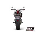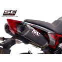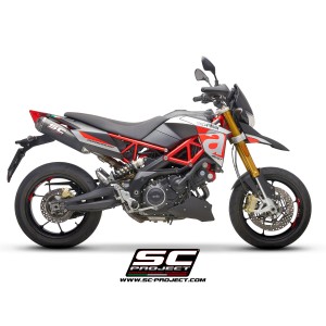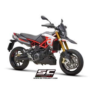 SC1-M, derivado del icónico silenciador SC1. La nueva SC1-M fue desarrollada por el departamento de R&D para la moto de potencia media. Corto, compacto y moderno para quienes prefieren las formas minimalistas. La nueva tapa final Twill de fibra de carbono con un carácter decidido y fuerte se adapta bien a las formas de la Aprilia Dorsoduro 900. La parte metálica de la sección de salida ha sido diseñada para integrarse mejor con el diseño deportivo de la tapa de carbono. El silenciador está equipado con DB-killer y su sistema de bloqueo específico. El silenciador está homologado EURO 4. La parte externa se puede suministrar tanto en edición Titanium como Carbon. La abrazadera de fijación al chasis está realizada en Acero Inoxidable Aisi 304 pintado.