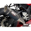 El silenciador SC1-R es la máxima expresión de potencia, calidad y soluciones de alta tecnología para los modernos modelos hiperdeportivos: con una estética deportiva y agresiva, este slip-on permite eliminar la válvula de escape original gracias al racor supresor en titanio suministrado en el kit. Esta solución permite una importante reducción de peso y permite situarse dentro de los decibelios permitidos para el uso en pista: 105dB @ 5500 rpm con dB-killer instalado que pasan a ser 105dB @5500rpm/min sin dB-killer. Para el uso en competición, el dB-killer es desmontable: la boca de salida obtenida mediante el proceso de hidroformado y el embellecedor de fibra de carbono con su forma romboidal y asimétrica hacen del slip-on SC1-R la mejor elección para esta moto.