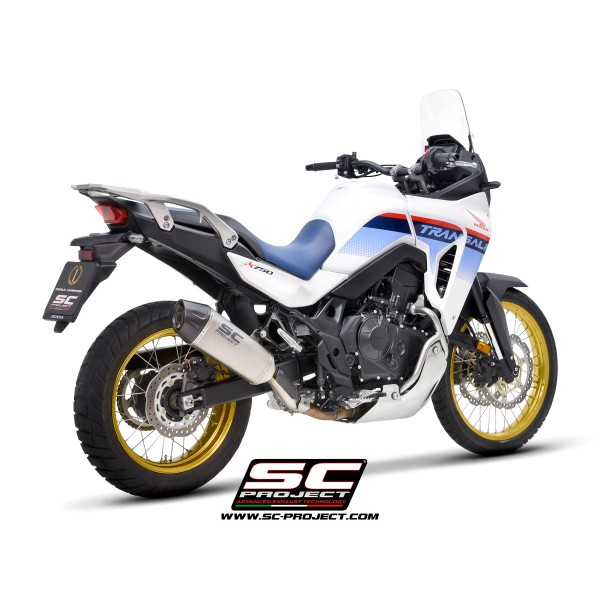 Este producto ha sido probado y desarrollado con una configuración específica para Honda Transalp XL750: el kit incluye un protector térmico específico de fibra de carbono, el certificado de homologación específico para uso legal en carretera y se enriquece con una placa de acero inoxidable incorporada en la abrazadera del tubo, con el logotipo de SC-Project grabado con tecnología láser. El producto es completamente plug and play, puede instalarse sin modificaciones y es compatible con las maletas laterales originales. La versión en carbono del silenciador X-Plorer II se realiza con una prestigiosa placa de aluminio con el logotipo de SC-Project, la misma utilizada en los sistemas de escape suministrados a los equipos oficiales por el Departamento de Carreras de SC-Project: la versión en titanio, en cambio, se realiza con un elegante marcado láser del logotipo de SC-Project.