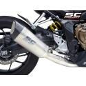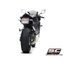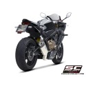 El silenciador SC1-R está creado y desarrollado a partir de la experiencia del departamento de carreras de SC-Project en las competiciones mundiales más importantes. Un look de líneas tensas y decididas enriquecerá Tu Honda CBR650R haciéndola única y exclusiva. La salida obtenida por hidroformado y el fondo de fibra de carbono con forma romboidal asimétrica hacen que el silenciador SC1-R sea inimitable. El cuerpo exterior ligero está disponible en versiones de Titanio y Carbono. Las soldaduras T.I.G., el material fonoabsorbente resistente a muy altas temperaturas y los casquillos de inserción mecanizados en macizo mediante mecanizado CNC embellecen el silenciador SC1-R. En la versión con cuerpo de Titanio, el departamento de R&D de SC-Project quiso hacer más elegante el SC1-R imprimiendo el Logo con láser, sin distorsionar su aspecto, mientras que en la versión de Carbono, un inserto con el logo de SC-Project está aplicado en el silenciador como en las versiones de nuestros escapes utilizados en Competiciones.
