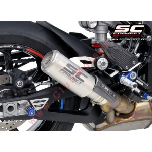 El silenciador CR-T es la firma inconfundible del estilo SC-Project Racing. Multi-Champion Moto2 fue creado para satisfacer a los mejores equipos y pilotos. Estudiado y desarrollado para dar un carácter deportivo y de carreras a tu BMW S 1000 RR con un Sonido profundo y bronco, es único en el panorama de los silenciadores del mercado de accesorios. El icónico silenciador está disponible en variantes de Titanio y Carbono con malla de Titanio en la tubería de salida. Para obtener el mejor rendimiento, el CR-T está construido con materiales derivados del sector aeronáutico, como el Titanio o la Fibra de Carbono con tratamiento dedicado para soportar temperaturas muy altas. Soldadura de soporte y racor con T.I.G.. Los casquillos de acoplamiento son mecanizados a partir de CNC macizo, para garantizar el mejor acoplamiento. El kit incluye el protección termal de carbono.