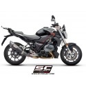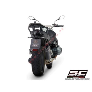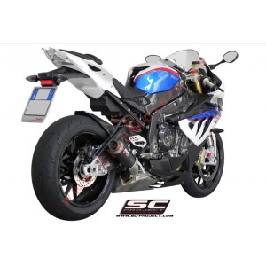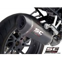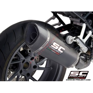 El silenciador SC1-R es creado y desarrollado por la experiencia del departamento de carreras SC-Project en las Competiciones Mundiales más importantes. Un look de líneas tensas y decididas enriquecerá Su Moto haciéndola única y exclusiva. La boca de salida obtenida por hidroconformado y con tapa de fibra de carbono de forma romboidal asimétrica hacen inimitable el silenciador SC1-R. El ligero cuerpo exterior está disponible en las versiones de Titanio y Carbono. Las soldaduras a T.I.G., el material absorbente de sonido resistente a las altísimas temperaturas y los casquillos de injerto obtenidos a partir del pleno mediante trabajo CNC embellecen el silenciador SC1-R. En la versión con cuerpo de Titanio el departamento R&D de SC-Project ha querido hacer el SC1-R más elegante imprimiendo el logo por láser, sin desnaturalizar el look, mientras que en la versión en Carbono, sobre el silenciador se remacha un inserto con el logo SC-Project como en las versiones de nuestras descargas utilizadas en las Competiciones. Protección termal de carbono incluido en el kit.