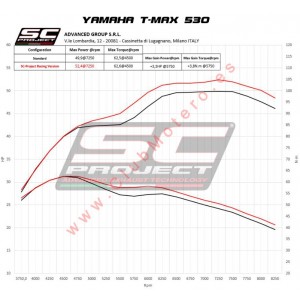 La prueba de dinamómetro es el resultado del proceso de investigación y desarrollo en T-Max 530: para la versión homologada euro4 con kat dentro, el aumento de rendimiento máximo es de 1,2 hp a 7.250 rpm, y para la configuración de carrera, el aumento de rendimiento máximo es 2 , 5 hp a 7.250 rpm.