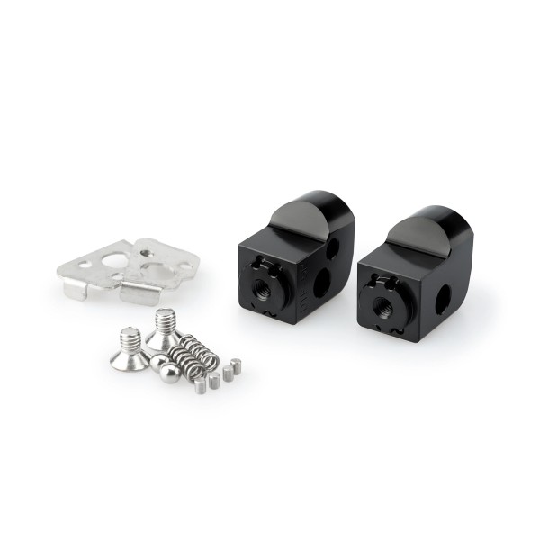 Son específicos para cada modelo, asegurando un ajuste perfecto, e incorporan marcas milimétricas que permiten regular la estribera con total precisión según las preferencias de cada motorista. Su construcción robusta, junto con un diseño compacto y un estilo claramente deportivo, los convierten en una opción ideal para los más exigentes.
