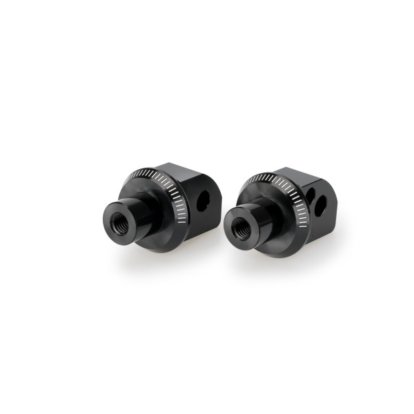 Herrajes mecanizados a partir de un bloque de aluminio Ergal 7075 de altas prestaciones y anodizados en color negro. Son la transmisión perfecta para conectar nuestras estriberas con los soportes originales de la motocicleta.