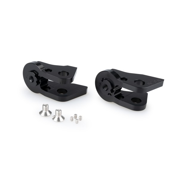 Son específicos para cada modelo, asegurando un ajuste perfecto, e incorporan marcas milimétricas que permiten regular la estribera con total precisión según las preferencias de cada motorista. Su construcción robusta, junto con un diseño compacto y un estilo claramente deportivo, los convierten en una opción ideal para los más exigentes.