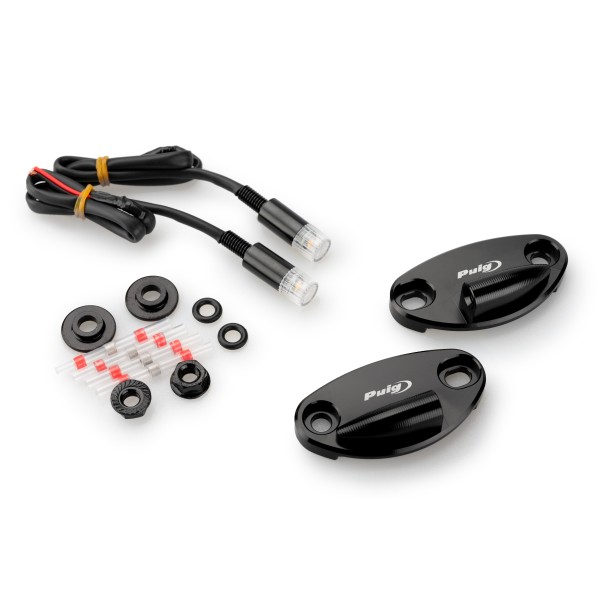Para ello estas tapas de retrovisor incorporan los compactos y polivalentes  intermitentes Tab homologados. Las tapas están fabricadas en aluminio de alta calidad con acabado anodizado en color negro, resultando una pieza ligera, discreta y elegante, que junto al intermitente Tab dan un toque personal manteniendo la esencia deportiva de motos R como la Kawasaki ZX10R, Yamaha R1, Honda CBR 1000RR y Ducati Panigale V2 / V4.