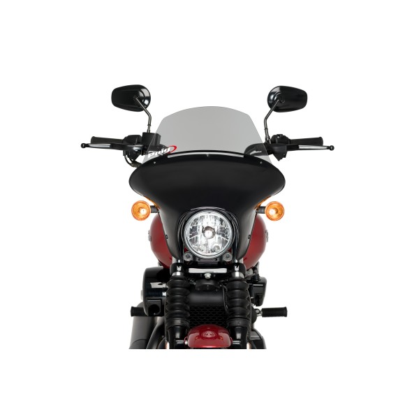 La pantalla transparente en material PMMA se puede situar en dos alturas distintas y deberá ser instalada por el comprador con el kit de tornillería incorporado.  Está disponible para los modelos custom más populares: Harley Davidson, Honda, Indian, BMW, Kawasaki, Suzuki y Yamaha.