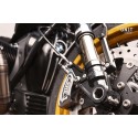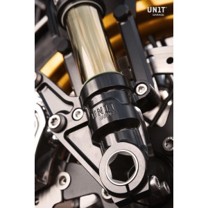 Para aumentar el rendimiento de su R18, hemos estudiado y probado este kit completo que permite el montaje de una horquilla Upside Down Ohlins. La bicicleta cambia de carácter y se vuelve mucho más divertida y usable en cualquier tipo de camino. Esto le permitirá tener una suspensión de carrera personalizada y la comodidad de conducción será fantástica. Hemos implementado una fantástica horquilla Ohlins FG 424 con platos y pies diseñados ad-hoc y mecanizados desde macizo al CNC. Los ajustes de compresión y extensión se realizan fácilmente. Se ha rediseñado el diseño de placas y patas para que todo el frontal quede muy "malo", y que todo sea plug and play. Se pueden reutilizar: las pinzas originales y los correspondientes tornillos, el soporte del faro y las torretas del manillar originales, la pipa de dirección, las tuercas de sujeción y los cojinetes.