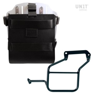 Placa portabolsas de aluminio anodizado con frontal de piel regulable. Se adhiere rápidamente a nuestros marcos portabolsas con el sistema de liberación rápida código U000 ya incluido y montado en la parte posterior de la placa , que está equipada con un bloqueo para bloquear en el marco mismo. La placa crea una superficie de montaje plana en el lateral de la moto, esto permitirá el transporte de bolsas sueltas u otros objetos, como sacos de dormir, chaquetas, etc. La solapa frontal, con atención a los detalles más pequeños con acabados de cuero de 3 mm, se puede ajustar con los deslizadores suministrados y se puede quitar muy rápidamente de la placa.