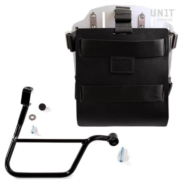 Placa portabolsas de aluminio anodizado con frontal de cuero ajustable. Se fija rápidamente a nuestros marcos portabolsas con el sistema de liberación rápida código U000 ya incluido y montado en la parte posterior de la placa , que está equipada con un bloqueo para bloquear en el propio marco. La placa crea una superficie de montaje plana en el lateral de la motocicleta, esto permitirá el transporte de bolsas sin accesorios u otros objetos, como sacos de dormir, chaquetas, etc. La solapa frontal, cuidada hasta el más mínimo detalle con acabados en piel de 3 mm, se puede ajustar mediante los cursores suministrados y se puede retirar muy rápidamente de la placa.