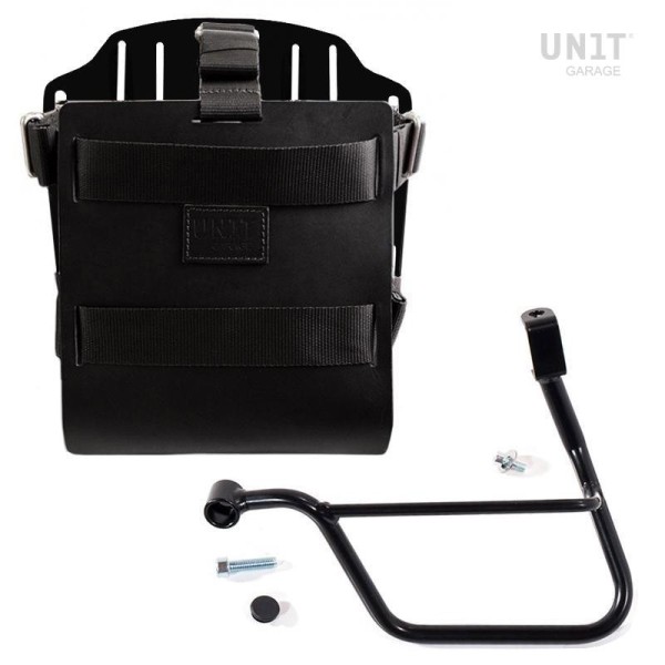 Placa portabolsas de aluminio anodizado con frontal de cuero ajustable. Se fija rápidamente a nuestros marcos portabolsas con el sistema de liberación rápida código U000 ya incluido y montado en la parte posterior de la placa , que está equipada con un bloqueo para bloquear en el propio marco. La placa crea una superficie de montaje plana en el lateral de la motocicleta, esto permitirá el transporte de bolsas sin accesorios u otros objetos, como sacos de dormir, chaquetas, etc. La solapa frontal, cuidada hasta el más mínimo detalle con acabados en piel de 3 mm, se puede ajustar mediante los cursores suministrados y se puede retirar muy rápidamente de la placa.