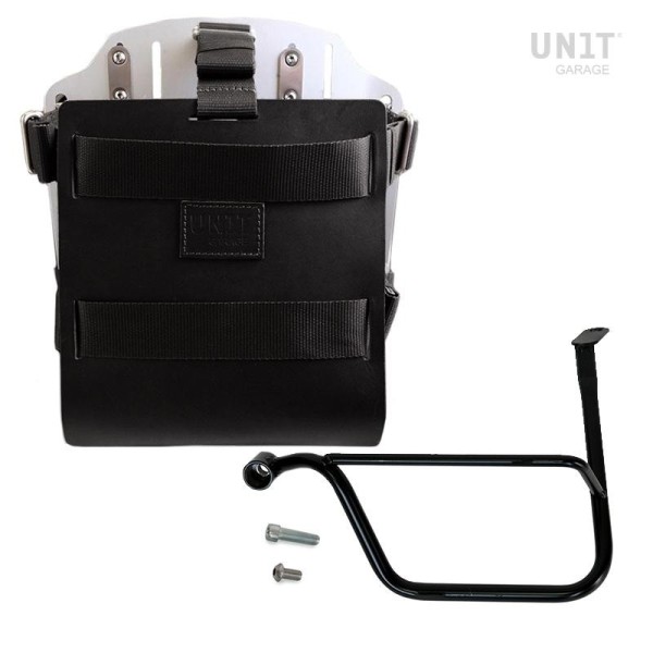 Placa portabolsas de aluminio anodizado con frontal de piel regulable. Se adhiere rápidamente a nuestros marcos portabolsas con el sistema de liberación rápida código U000 ya incluido y montado en la parte posterior de la placa , que está equipada con un bloqueo para bloquear en el marco mismo. La placa crea una superficie de montaje plana en el lateral de la bicicleta, esto permitirá el transporte de bolsas sueltas u otros objetos, como sacos de dormir, chaquetas, etc. La solapa frontal, con atención a los detalles más pequeños con acabados de cuero de 3 mm, se puede ajustar con los deslizadores suministrados y se puede quitar muy rápidamente de la placa.