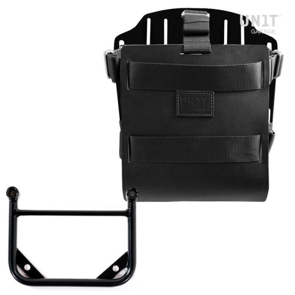 Placa portabolsas en aluminio anodizado con frontal de piel regulable. Se fija rápidamente a nuestros marcos portabolsas con el sistema de liberación rápida código U000 ya incluido y montado en la parte posterior de la placa , que está equipada con un candado para bloquear en el marco mismo. La placa crea una superficie de montaje plana en el lateral de la bicicleta, esto permitirá el transporte de bolsas sueltas u otros objetos, como sacos de dormir, chaquetas, etc. La solapa frontal, con atención a los detalles más pequeños con acabados de cuero de 3 mm, se puede ajustar con los deslizadores suministrados y se puede quitar muy rápidamente de la placa.