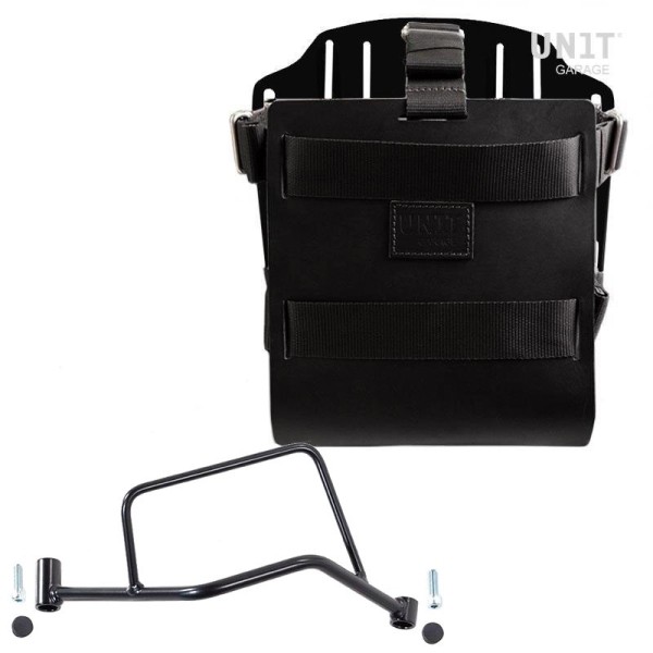 Placa portabolsas de aluminio anodizado con frontal de piel regulable. Se acopla rápidamente a nuestros marcos portabolsas con el sistema de liberación rápida código U000 ya incluido y montado en la parte posterior de la placa , que está equipada con un candado para bloquear en el marco mismo. La placa crea una superficie de montaje plana en el lateral de la bicicleta, esto permitirá el transporte de bolsas sueltas u otros objetos, como sacos de dormir, chaquetas, etc. La solapa frontal, con atención a los detalles más pequeños con acabados de cuero de 3 mm, se puede ajustar con los deslizadores suministrados y se puede quitar muy rápidamente de la placa.