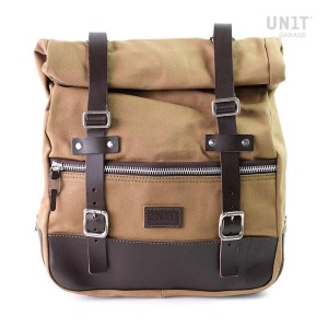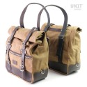 Simple y puro como los materiales con los que fueron construidos. Par de bolsos hechos a mano en Italia en resistente algodón impermeable de alta calidad. Atención al detalle con acabados de cuero de 3 mm. Universal es adaptable a todas las motocicletas, simplemente moviendo el ajuste de las bandas centrales cambia la altura desde el suelo. La parte posterior de la bolsa está equipada con ganchos de tela para fijar en la bicicleta. En la parte delantera, un gran bolsillo con cremallera para teléfono y documentos. Una vez fuera de la bicicleta, puede usar las bandas centrales sobre el hombro o sobre el hombro.