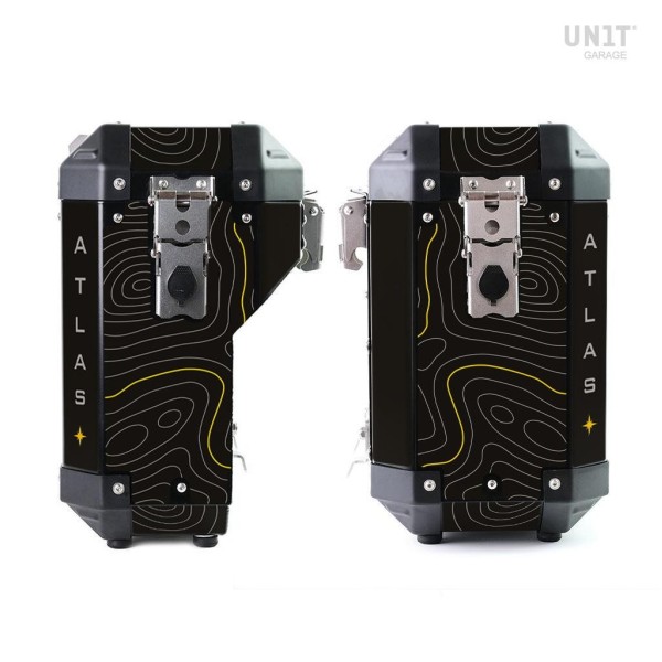 Queríamos bolsos elegantes, clásicos y resistentes, con bonitas bisagras de acero y cuidados detalles: detalles creados para la aventura y resistentes a todas las condiciones. Se pueden fijar a cualquier marco de tubo redondo con un diámetro de 18 mm gracias al sistema de acoplamiento de seguridad colocado en la parte posterior de la bolsa, el cierre se ensancha automáticamente para un fácil montaje y desmontaje del marco de las bolsas, la palanca interna está mecanizada por CNC desde macizo en aleación de aluminio de alta calidad. La tapa es completamente extraíble y se puede abrir por ambos lados, está provista de fijaciones en el interior, y se incluye una banda elástica para usar como soporte de guantes, documentos y pequeños objetos. El sistema de retención de la tapa es de cuero con broches extraíbles y los cierres están diseñados para albergar un candado adicional al suministrado. El cuerpo de la bolsa está completamente forrado con un resistente neopreno de 2,5 mm capaz de absorber los golpes. Las bisagras, cerraduras y todos los detalles son en acero inoxidable electropulido, algo que no encontrarás en ningún producto similar del mercado. Las esquinas son de ABS resistente que se puede reemplazar en caso de caída, así como todos los componentes. Nuestras bolsas de aluminio están completamente Made in Italy, ensambladas a mano una a una.