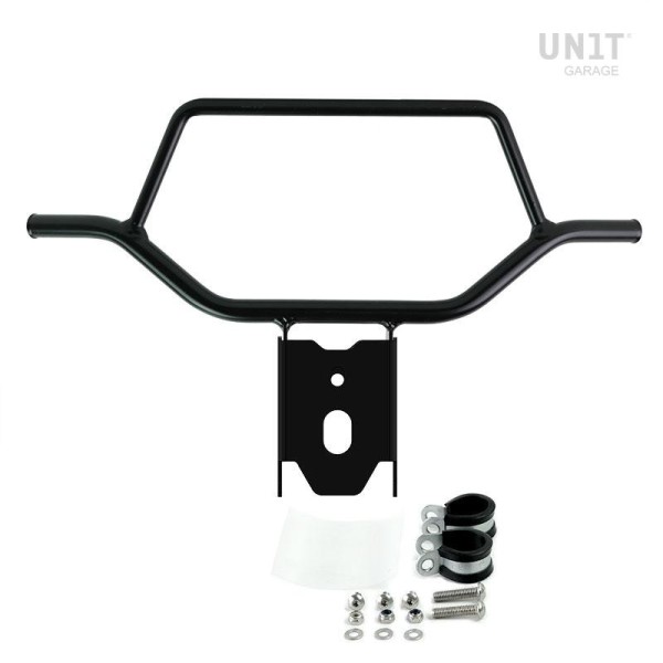 Se puede instalar tanto en el lado derecho como en el izquierdo de la bicicleta. Con la parte extraíble incluida en el kit de montaje se puede montar a dos alturas diferentes. Está fabricado en acero tratado con pintura en polvo epoxi negro mate. Viene completo con abrazaderas, tornillos y adhesivo protector.