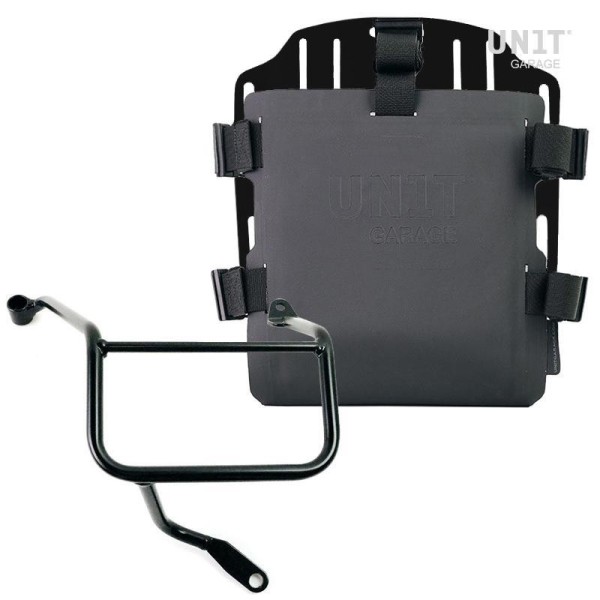 placa, que está provista de un bloqueo para bloquear en el propio marco. La placa crea una superficie de montaje plana en el costado de la bicicleta, esto permitirá el transporte de bolsas sueltas u otros objetos, como sacos de dormir, chaquetas, etc. La solapa frontal, con atención a los detalles más pequeños, con acabados de Hypalon, se puede ajustar mediante los deslizadores suministrados y se puede quitar muy rápidamente de la placa.