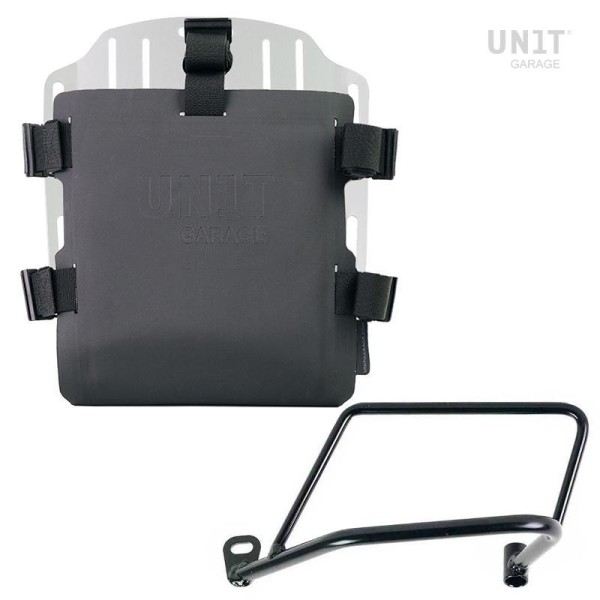 placa, que está equipada con un bloqueo para bloquear el propio marco. La placa crea una superficie de montaje plana en el lateral de la motocicleta, esto permitirá el transporte de bolsas sin accesorios u otros objetos, como sacos de dormir, chaquetas, etc. La solapa frontal, cuidada hasta el más mínimo detalle, con acabados Hypalon, se puede ajustar mediante los cursores suministrados y se puede retirar muy rápidamente de la placa.